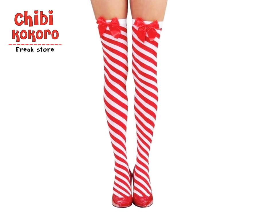 Medias bucaneras rayadas blanco y rojo con moños rojos